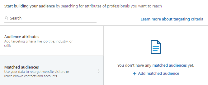Možete postati sofisticirani u svom ciljanju na LinkedInu tako što ćete iskoristiti značajku Odgovarajuća/Podudarna publika (Matched Audiences) koja vam omogućuje ciljanje izvan podataka na LinkedIn profilima. Na primjer, možete prenijeti popis kontakata s vašeg CRM-a ili alata za marketinšku automatizaciju ili ponovno usmjeriti posjetitelje vaše web stranice putem ugrađene oznake Insight.