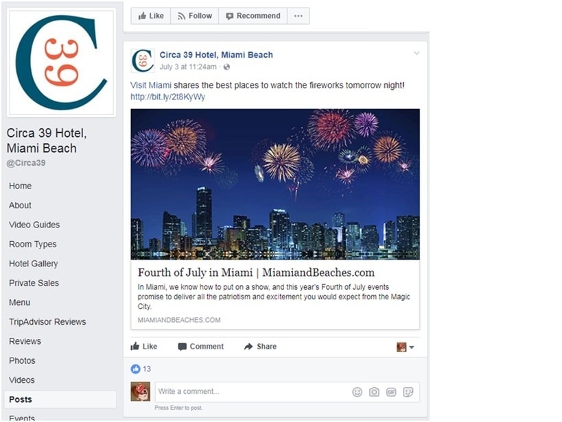 Primjer : The Circa 39 Hotel u Miamiju podijelio je članak o tome gdje možete vidjeti najbolji vatromet 4.srpnja.