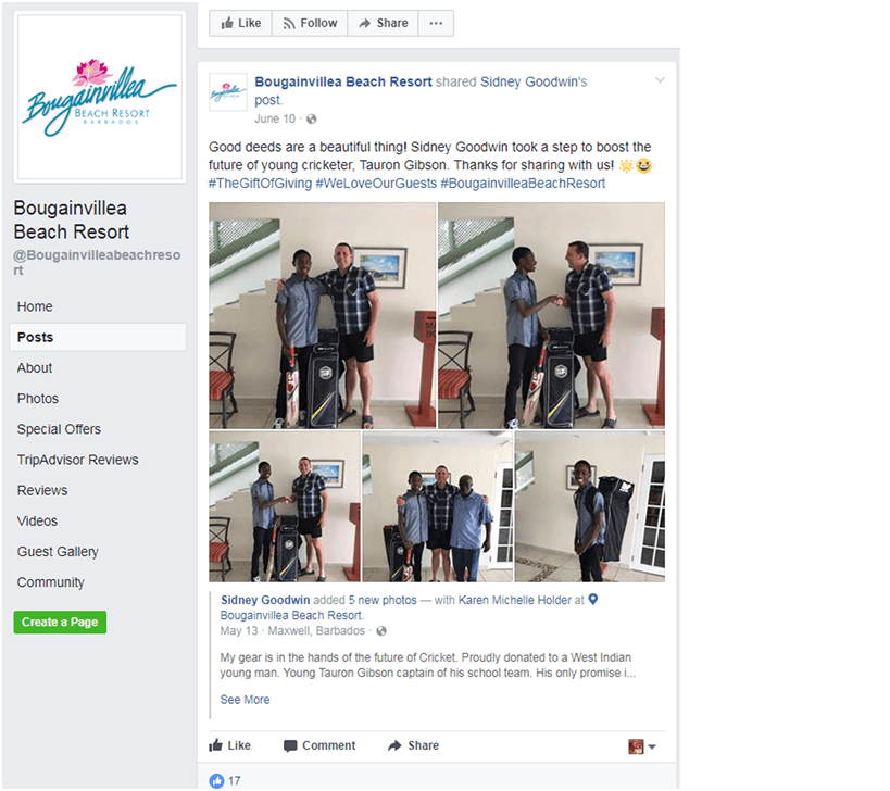 - Dijelite sadržaj koji naprave vaši gosti. To mogu biti slike, video, statusi koji spominju vaš smještajni objekt. Ovo je brz i jednostavan način pribavljanja sadržaja za svoju stranicu. Uvijek pitajte goste za dozvolu prije objavljivanja. Primjer: The Bougainvillea Beach Resort podijelio je sliku gosta koji je donirao svoju sportsku opremu srednjoškolcima.