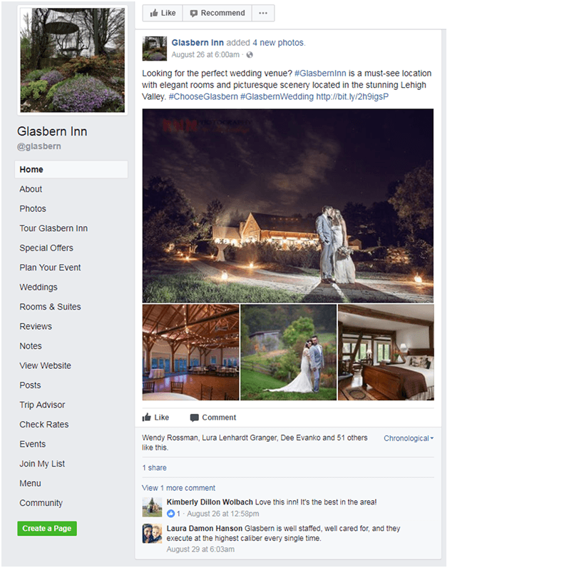 Glasbern Inn promovira svoje usluge organiziranja vjenčanja na Facebook-u s linkom na web stranicu
