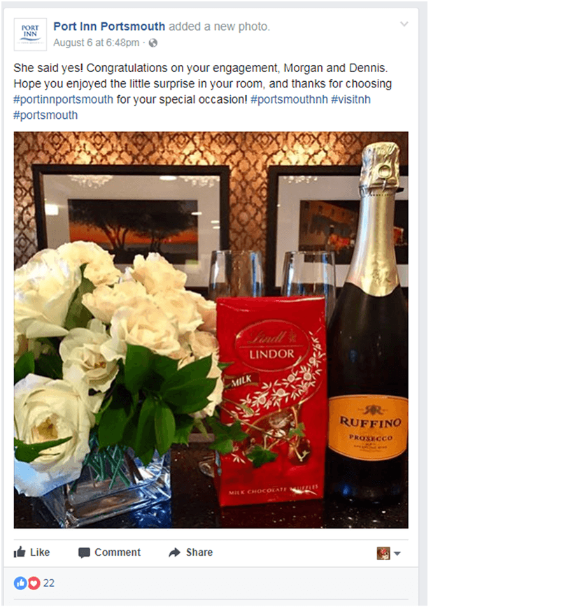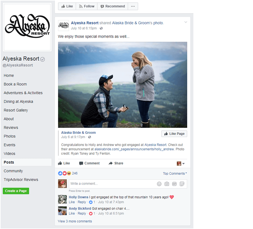 Primjer: The Alyeska Resort podijelio je sliku kako bi čestitao paru koji se zaručio u njihovom objektu.
